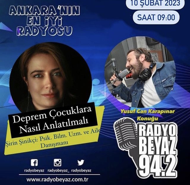 Ülkemizin 5 şubat tarihinde yaşamış olduğu deprem felaketinden  sonra  sevilen radyo programı Beyaz Radyo’nun 10 şubatta 2023 tarihinde konuğu oldum ve felaketin çocukların psikolojisi üzerindeki etkisini anlattım.
